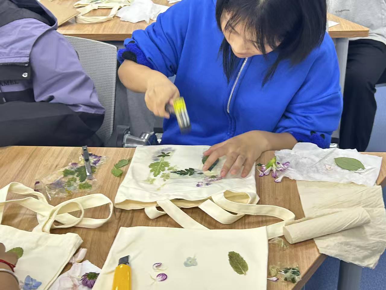 活动紧扣“自然与专业融合”的思路有序推进:开场环节,活动组织者结合建筑、规划专业对自然元素的运用需求,系统科普常见植物树叶的形态类别、纹理特性及色彩留存原理,既拓宽了同学们的自然知识视野,也为后续创作提供专业参考;实践阶段,同学们自由挑选银杏、枫叶、尤加利等植物素材,结合帆布包载体特性设计构图,通过“选叶固定—敲击拓印—细节调整”的步骤,将植物的自然纹路与斑斓色彩精准转印,过程中不时交流设计思路与敲拓技巧,部分同学还融入建筑线条元素,让作品兼具自然意趣与专业特色;展示环节,大家手持印有独特植物纹样的帆布包分享创作心得,从“叶片选择的巧思”到“色彩搭配的灵感”,现场氛围轻松热烈,充分展现了学子的创造力与协作力。
