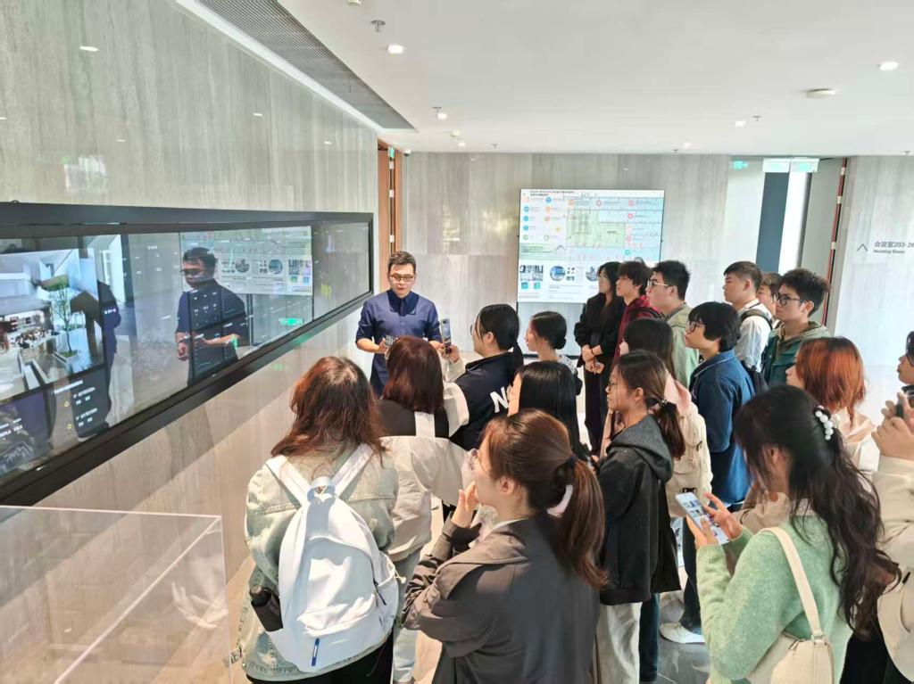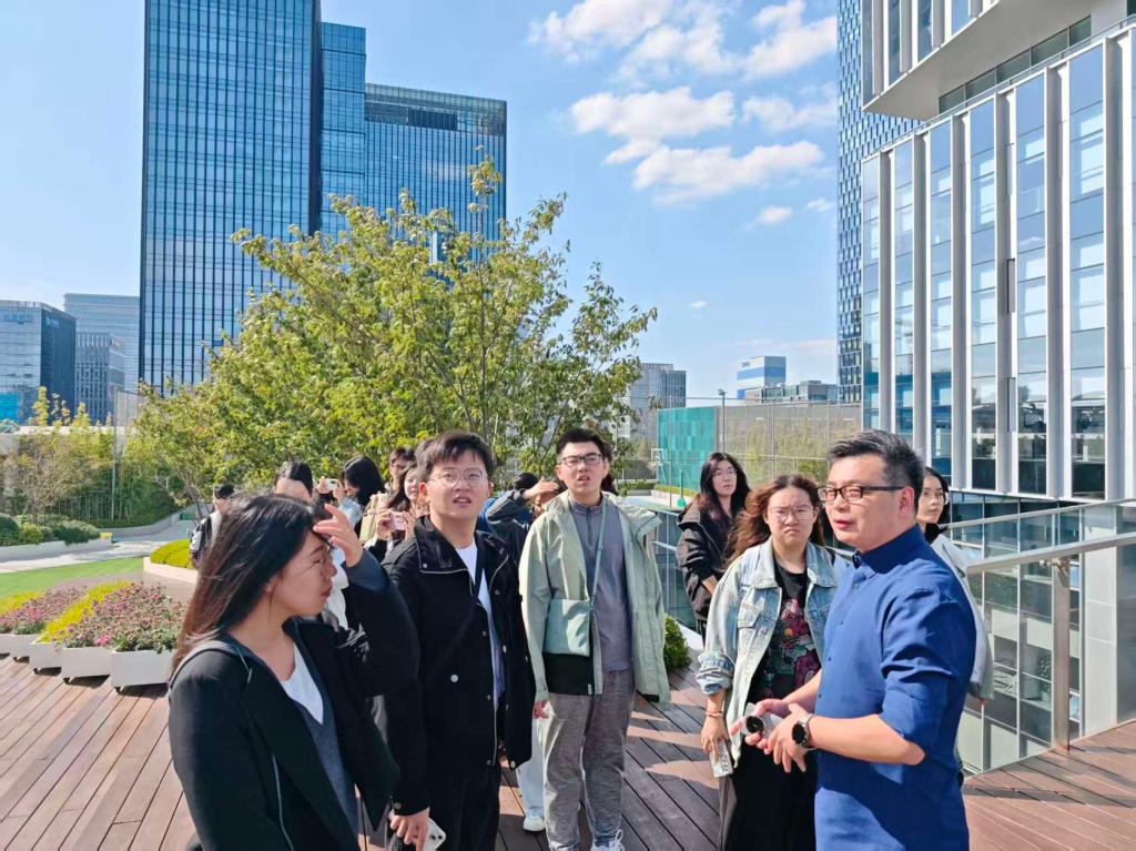 交流会期间,建筑协会学生代表首先随参会人员参观启迪设计大厦,重点关注大厦的绿色建筑设计细节与空间功能布局。学生们边看边记,结合协会日常开展的“建筑案例分析”活动,主动向工作人员请教低碳技术在建筑中的实际应用,加深对“绿色建筑落地实践”的理解。