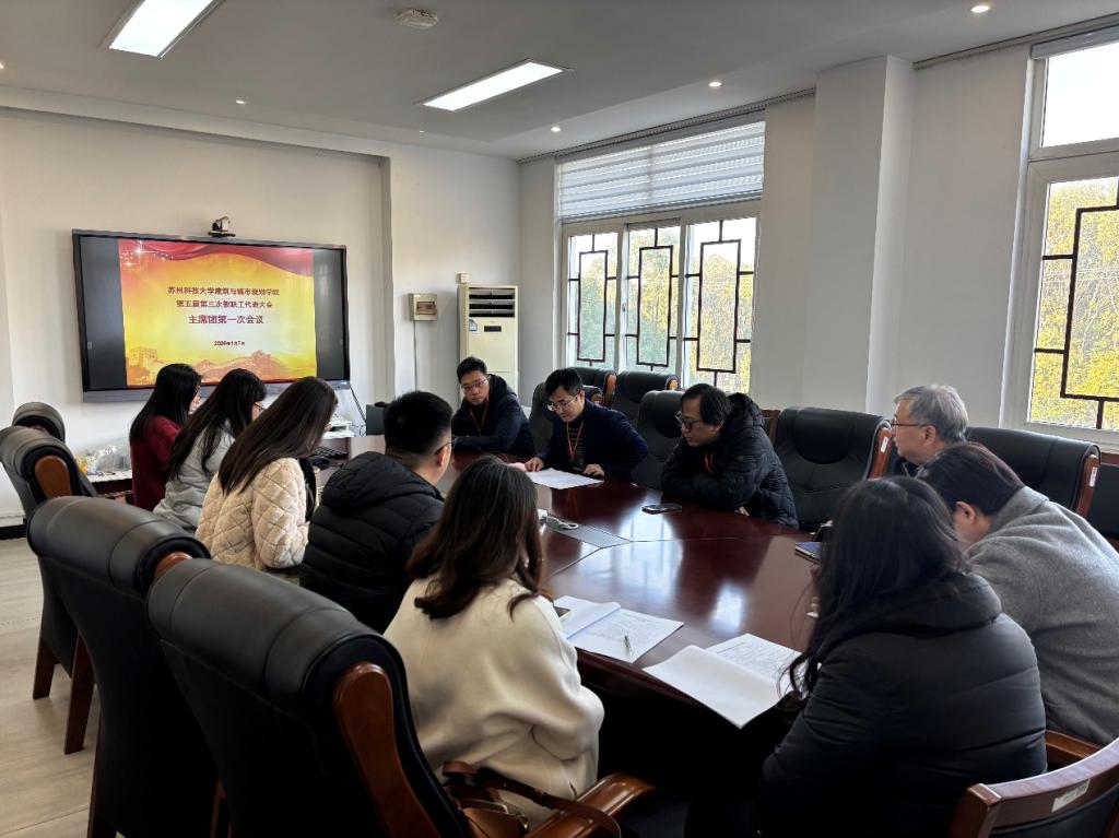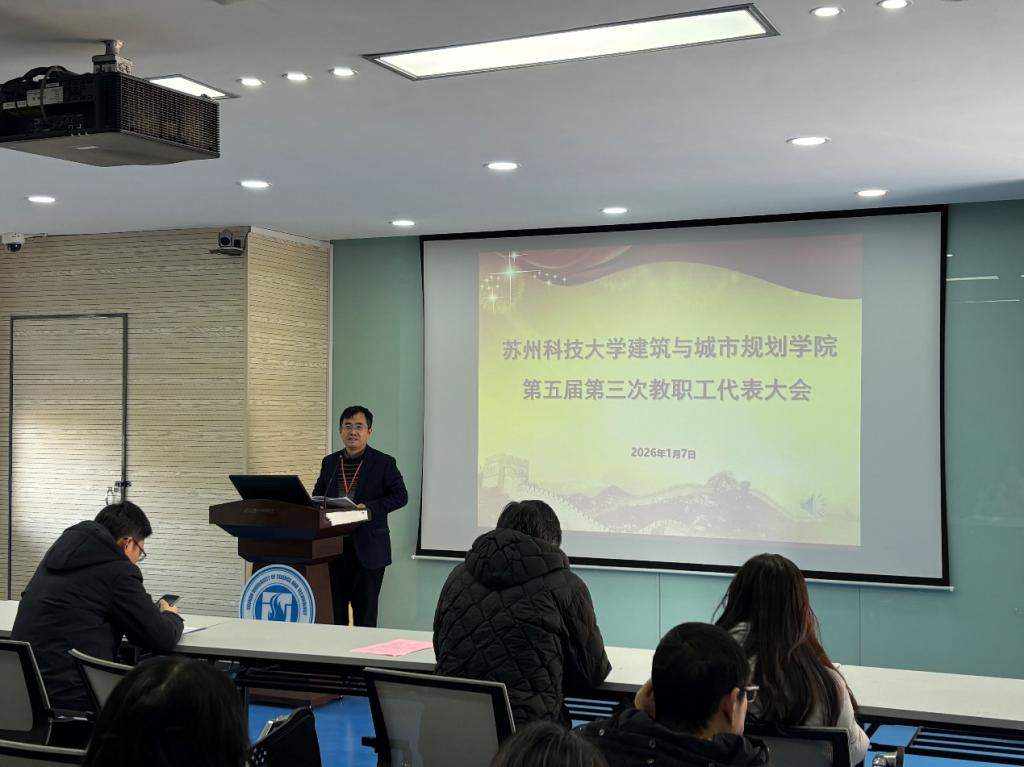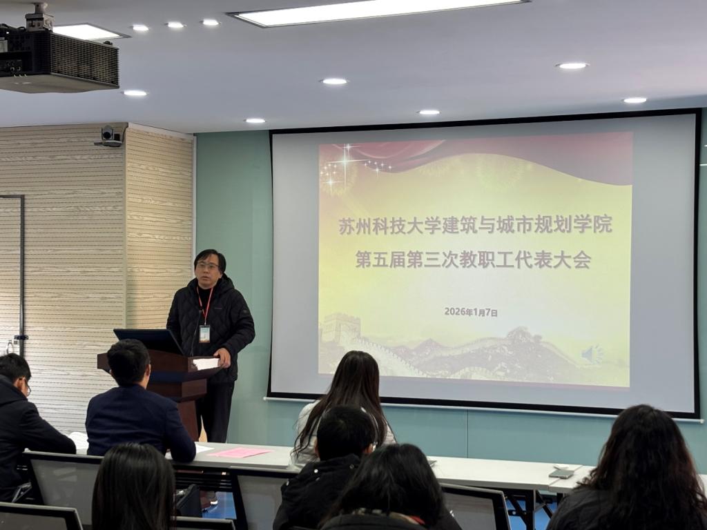 2026年1月7日下午,苏州科技大学建筑与城市规划学院第五届三次教职工代表大会在建筑馆212报告厅隆重召开。大会由学院分工会主席蒋灵德主持。学院党委书记刘志强、院长邱德华等党政领导班子成员出席大会,来自建筑系、规划系、园林系和行政部门的教职工代表参加了会议。