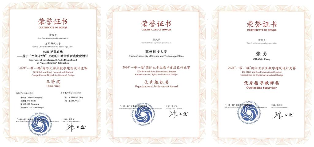建筑与城市规划学院张芳教授带领团队获得2024“一带一路”国际大学生数字建筑设计竞赛三等奖(指导教师:张芳、周曦。成员:董中竞、吴致德、谢天洋、刘恒轩宇)、苏州科技大学获得2024“一带一路”国际大学生数字建筑设计竞赛优秀组织奖、张芳教授获得2024“一带一路”国际大学生数字建筑设计竞赛获优秀教师指导奖。