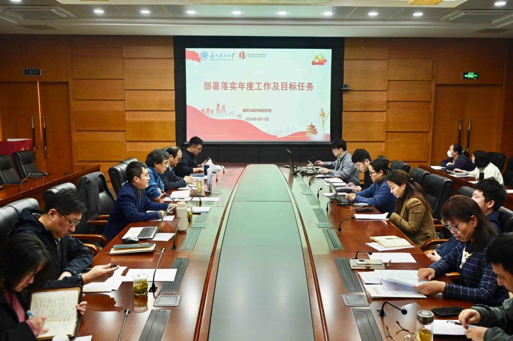4月15日上午,建筑与城市规划学院在建筑系馆一楼会议室召开2026年高质量发展工作及目标任务部署会议。学院全体领导班子成员、党委委员、院长助理、各系办主任、支部书记、工会委员等参加会议。会议由院长邱德华主持。